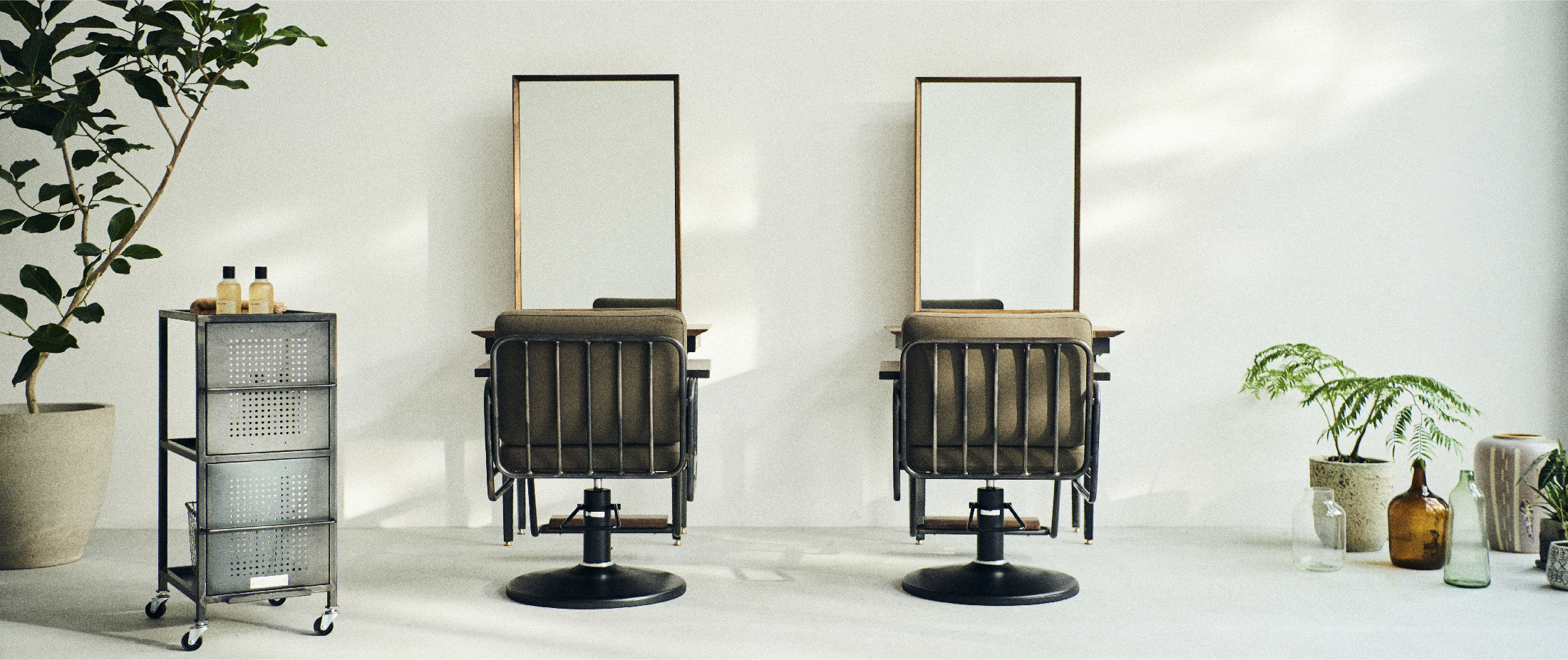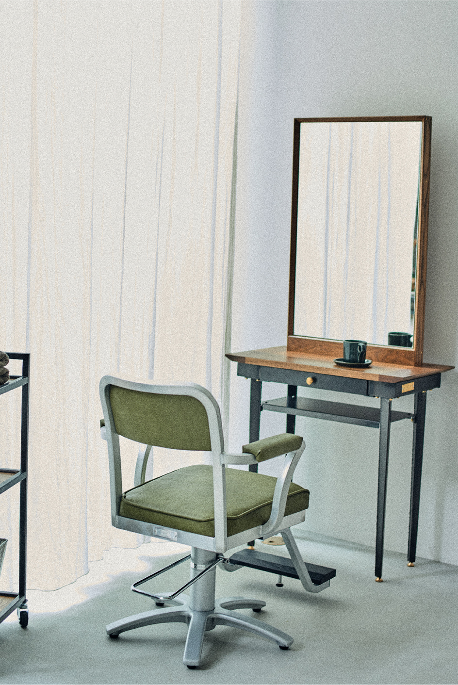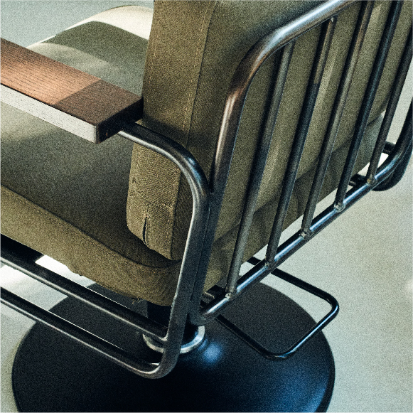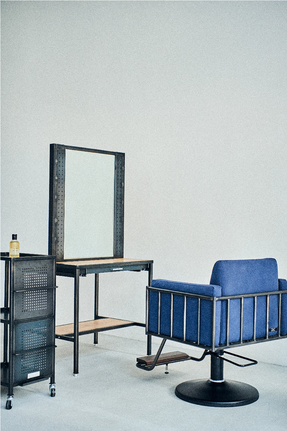 チェアやミラーなどの各部に使われる黒皮鉄は、鉄本来のキズや色ムラをあえて残し、使い込むほどに魅力を増す。