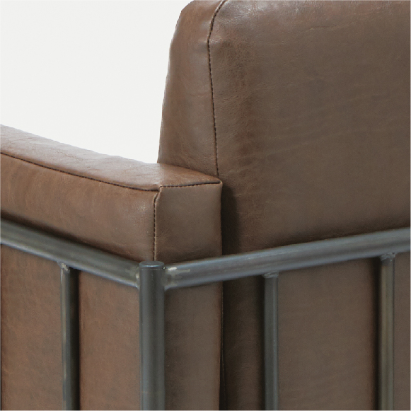 アイアンとファブリックの異素材の組み合わせによって生まれる独特の世界が感じられるモデル。ワイドな座面と安定感のあるアイアンフレームが包みこむような座り心地を生み出す。ネイビーとアーミーのミリタリー調ファブリックと、ヴィンテージ風のダークブラウンレザーの3色展開。クッションカバーの着せ替え可能。