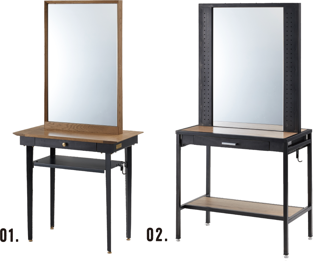 ブルックリンスタイルを追求した自立式ミラー。直線的なラインが特徴のウッドベースの「01」と無骨なインダストリアル感のあるアイアンベースの「02」の2種類。延長テーブル、ドライヤーフック付き。