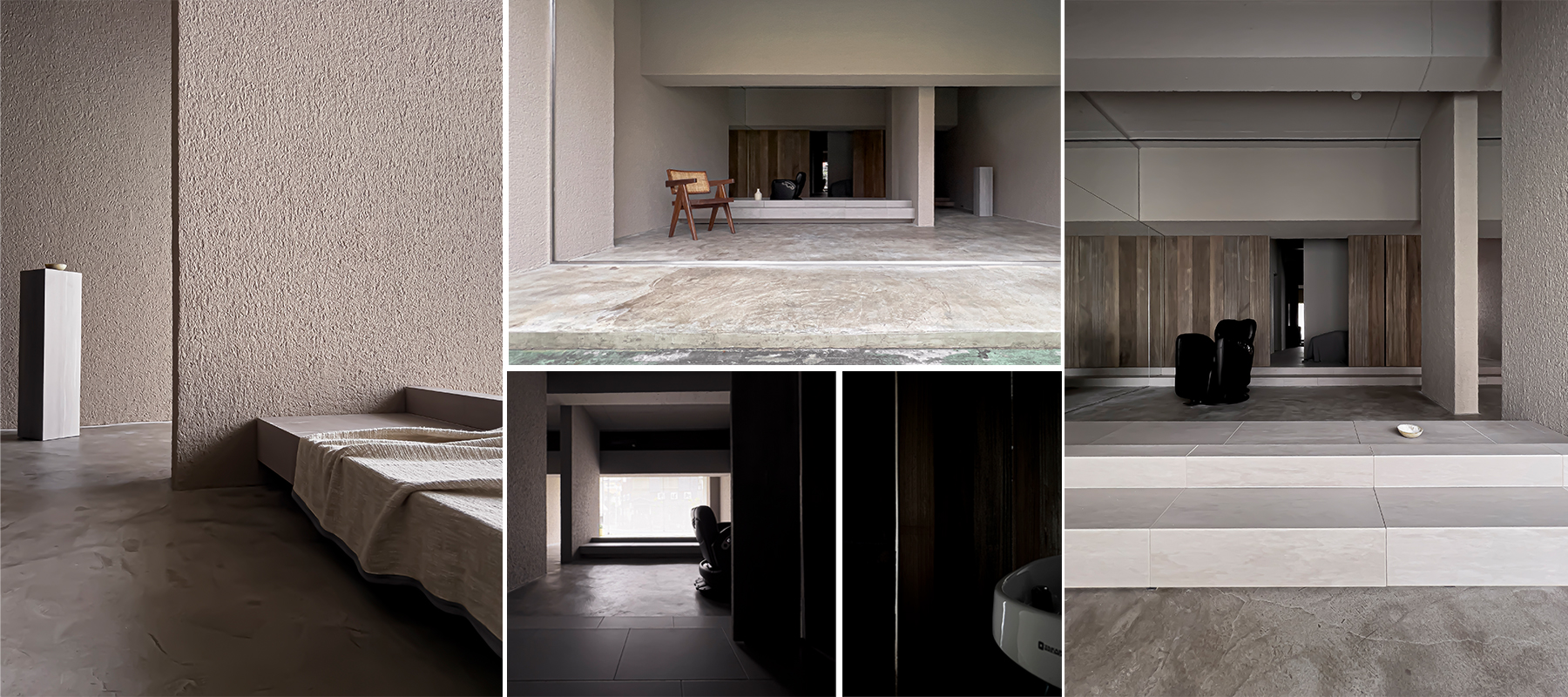 サロン部門では、その他に銀賞4作品、特別賞2作品が選出されました。のは「TEAL barber」。築50年のマンションの1階にある、1席のみのメンズオンリーサロンです。クライアントから提示された写真や、「ゆったりした時間」「飾らず落ち着く居心地の良さ」などのキーワードからオープンエアが感じられる軒下やピロティといった屋外空間をイメージし、巨大な壁や梁、土壁や古板など荒々しく外をイメージさせる構造や素材で空間を構成。