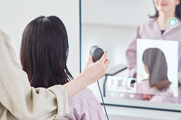 ミラー上に画像や動画を映し出し、来店中のコミュニケーションをサポートするスマートデバイスミラー。ミラーを通じて操作・紹介した内容は、カルテやお客様マイページに自動的に連携し、業務効率化にも繋がります。 -