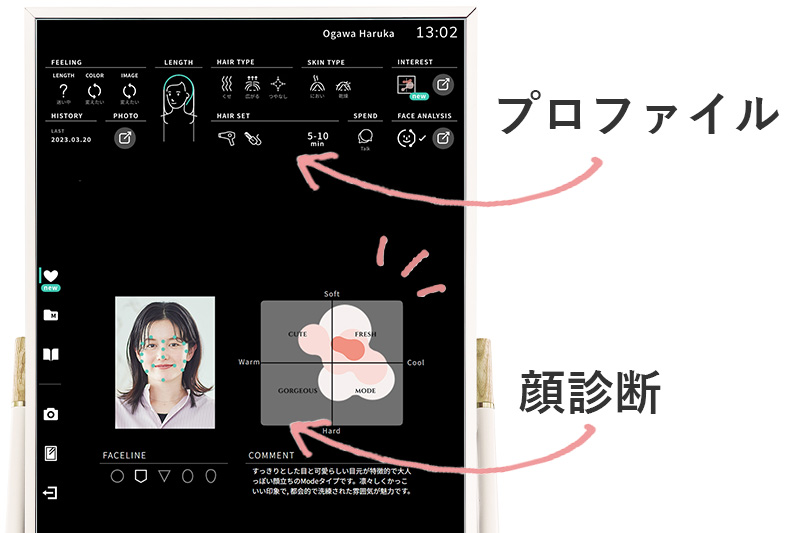 ホームカウンセリングの回答をミラー上部にアイコンで表示。お客様の要望や悩みを引き出した状態から会話をスタートできます。また、スタッフ間の情報共有も円滑に。