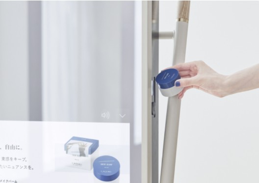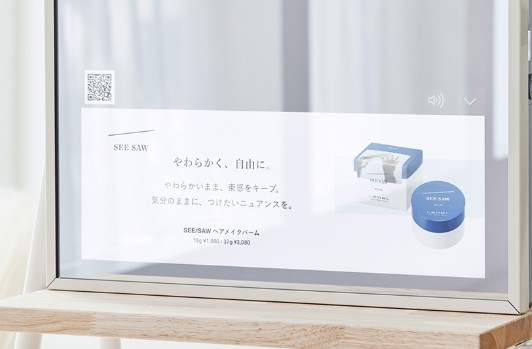 商品をミラー横のバーコードリーダーにかざすと、紐づいた動画や画像の情報がタイムリーに表示。商品を使用する際にさりげなくミラーに映しておくことで、自然とお客さまの関心を高めます。