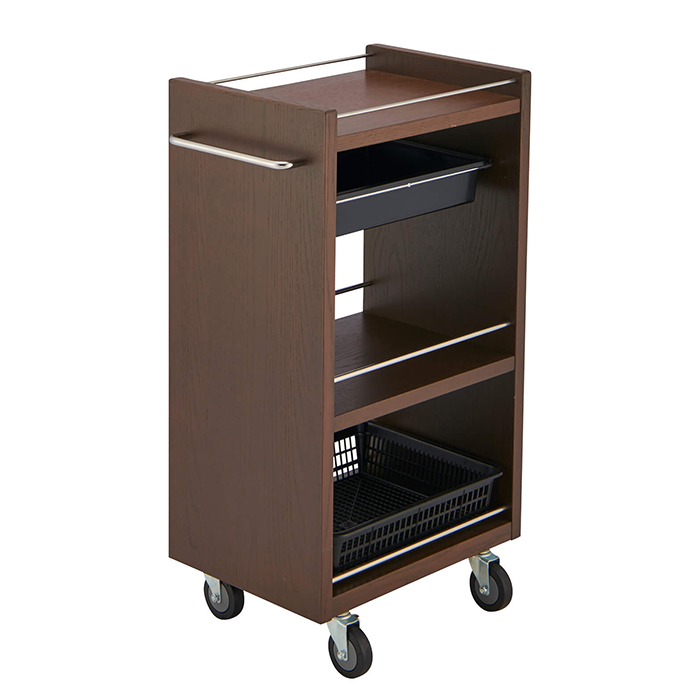 天然木化粧合板貼り(オーク材)の家具調ワゴン。天板の下には前に引き出せるバットを装備されています。