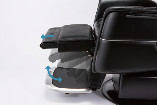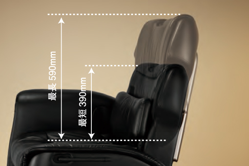 お客様の体格に合わせて背もたれの高さを調整できる新機構。最長時590mmの高さから最短390mmまで電動で無段階に伸縮します。シェービング時にはお客様の肩甲骨をしっかり支える位置でホールドし、ベッドのような寝心地を実現。女性のお客様のカットにも対応できます。