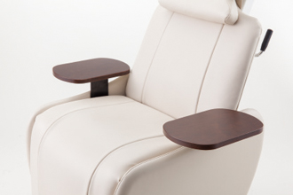 リーチェの両アーム上にテーブルを設置。リクライニングした状態で、ネイルケア~アートの施術が可能に。