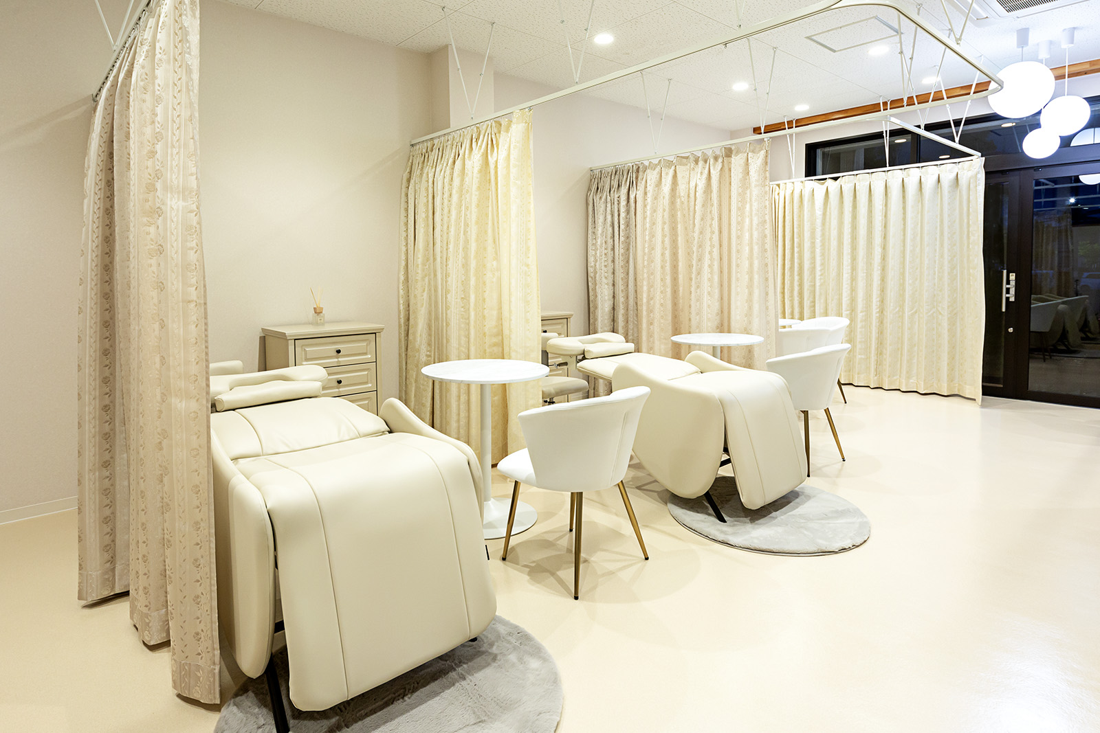 カウンセリングにも使用できるチェアは、手動でフラットな状態までリクライニング可能。アイラッシュ施術時に快適な寝角度に設定されているので、長時間の施術でも心地よく過ごせます。