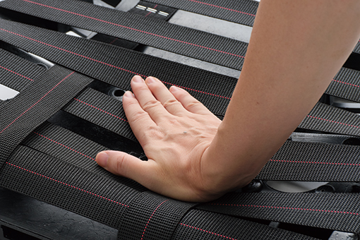 ウェビングをシートの土台に組み込み、身体を面でやさしく支える構造を採用。一人ひとりの体格や姿勢に応じてしなやかに追従し、上質な座り心地と寝心地を叶えます。