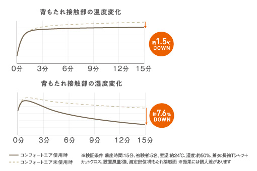 コンフォートエア有無による背もたれ接触部の温度及び湿度計測結果