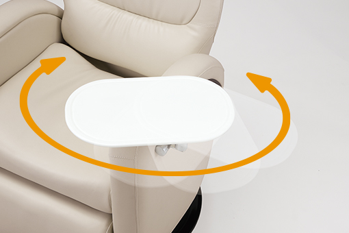 テーブルが回転するので、技術者が作業しやすく、お客様にも快適なポジションに調整できます。大きめのテーブルでジェルネイル時にはUVライトを置くことも可能。飲物を置いたり、雑誌を置くなど、サービステーブルとしても活躍します。 ※YSWタイプのみ