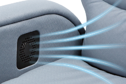 左右の手すり内側に搭載された送風ファンが、ムレやすい刈り布内部を涼しく快適に保ちます。また、冷えすぎを防ぐため、約8分経過すると自動的にファンが停止するオートパワーオフ機能を搭載。送風ファンはスイッチひとつで操作でき、風の強さは「HIGH(強)」と「LOW(弱)」の2段階に切り替え可能です。