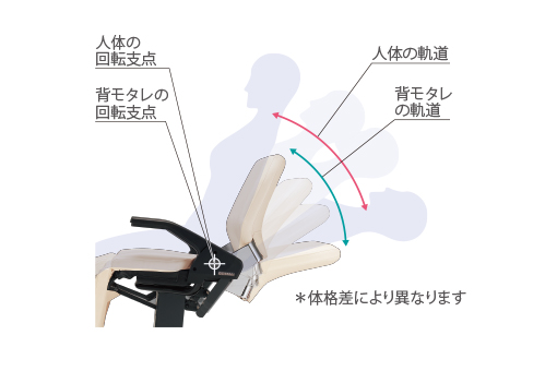 背モタレの回転支点を人間の腰の回転支点に近づけ、リクライニング時の服ズレ、腰の浮きなどの違和感を抑えています。