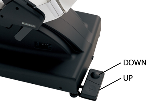 フットスイッチは使いやすさを考えチェア後方に固定。長押しでオートセット(UP)、オートリターン(DOWN)、短押しで微調整。足のみでコントロールができて便利です。