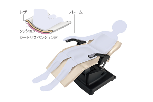 シートや背モタレの芯材に、適度に伸縮性のあるシートサスペンション材を使用。背モタレには最適なやわらかさのウレタンモールドクッションを採用。ハンモックのようにお客さまの体の凹凸に合わせ、やさしく包み込むようにフィットします。