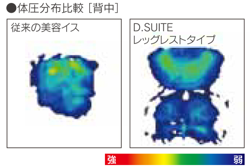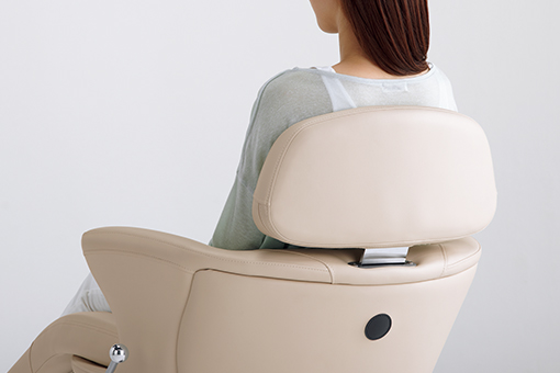 背もたれを高くして快適性を向上させつつ、厚みや形状を工夫し、視線と鏡を正対させる構造にすることで、従来と変わらない施術姓を可能にしました。