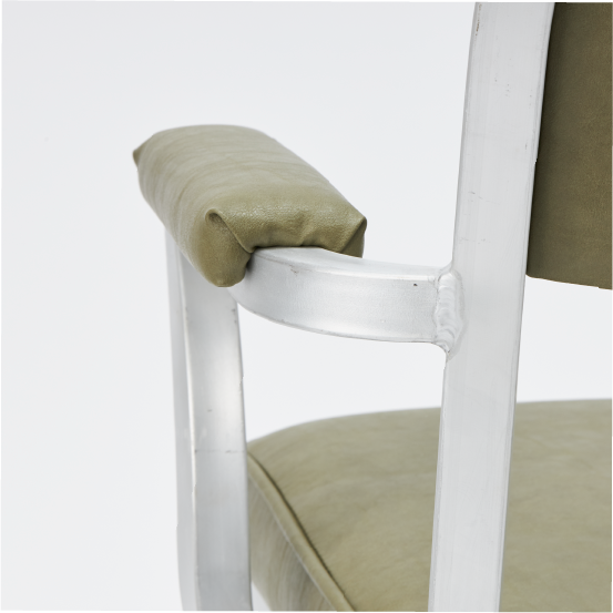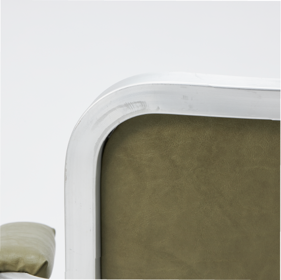 ミニマルなフォルムと無機質なアルミの縁取りが存在感を放つアメリカンダイナーを想起させるモデル。あえて加工時の傷や溶接跡を残したフレームとヴィンテージ感のあるレザーが、クラシカルでクールな印象に。