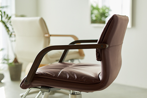 施術性の良さを追求し、薄くても心地良い背もたれを実現。厚みがない背もたれでロングヘアのカット時に段差が出にくく、近づきやすいのが特徴です。握りやすく手の置きやすい手すりは施術性も考慮した最適なサイズに仕上げています。