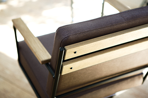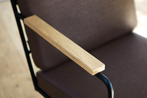シンプルなクッションとフレーム、木材を組み合わせたニュートラルなモデル。手すりと背もたれには厳選したオーク材を使用し、触るたびに経年変化を楽しめる仕上げを行っています。どんな空間にもしっくりと馴染む、癖のない佇まいです。