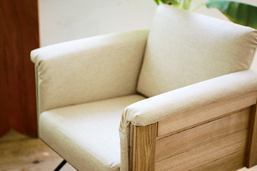 まるで木箱の中にクッションを詰め込んだような、大胆な意匠のモデル。座る人を四方向からラフ感タップリの木材とクッションで包み込み、優しく迎え入れます。自分が空間の一部になったような一体感を得られる、包容力のある逸品です。