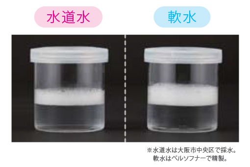 シャンプーの泡立ちがよく、洗浄効果を高め、髪や頭皮にやさしい水に含まれる硬度成分は、シャンプー剤の洗浄成分(界面活性剤)に対して、泡立ち効果を損なうなど、洗浄効果に影響を与えます。泡立ちが不充分な状態では、毛髪同士が擦れやすくなるため、毛髪や頭皮をいためることがあります。