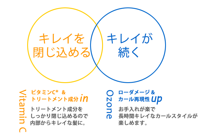ガラス化時にオゾンの力とビタミンC*の連携を加えた、オゾンガラス化でカール形状を“瞬間記憶”。