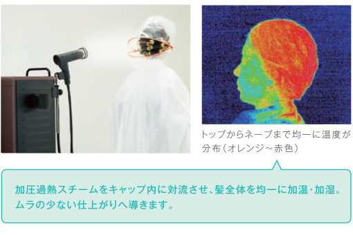 か圧過熱スチームの力で化粧品を浸透・定着。また、適切なクリープを行うことができ、仕上がり感がアップします。