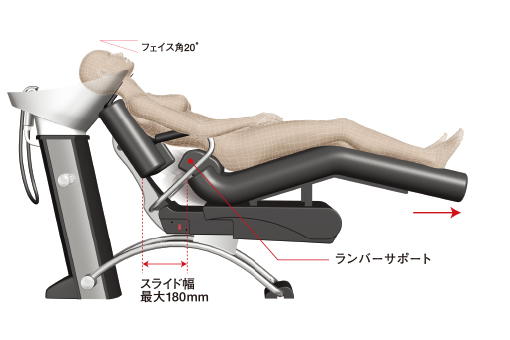 ランバーは、座面と連動して回転しながら腰にぴったりとフィット。シートへの接触部分を広げることにより、体圧の分布が広範囲になるため、やさしく、快適なシャンプー姿勢がキープできます。