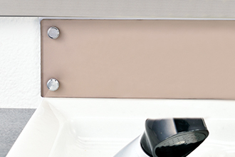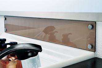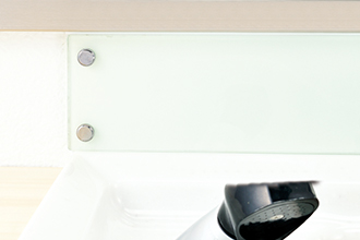 ガラス製のバックガードを設置し、シャンプー時の水ハネを防ぎます。