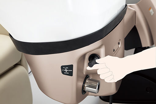 電動によりワンアクションでボウルがお客様の方向に移動し、フロントシャンプーのポジションに。また、お子様など小柄な方には、さらにお客様の方へ近づける微調節も可能です。