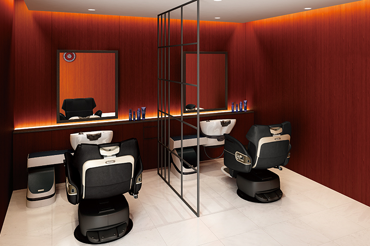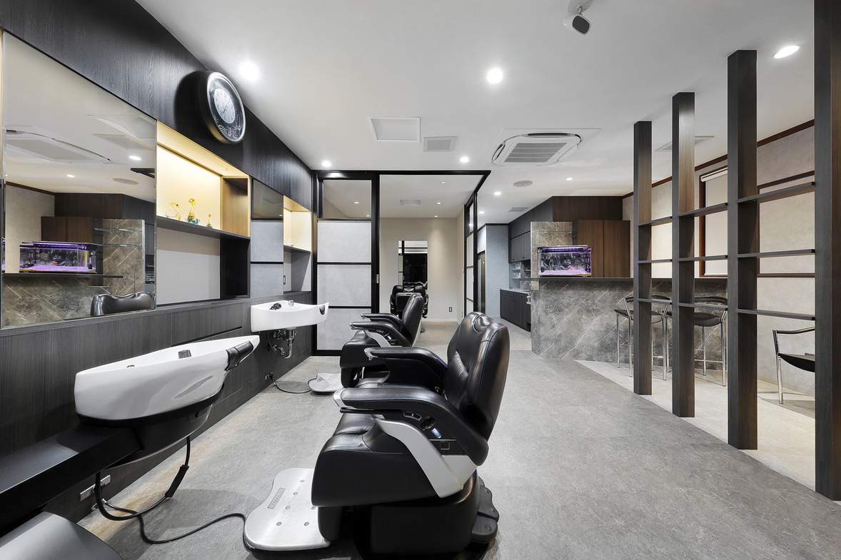 団塊ジュニア世代以上の大人の男性客をメインターゲットにしたサロン。特別感にあふれた、居心地の良い休日の癒し空間をイメージ。個室っぽいプライベートゾーンを演出しながら、大人の男性にふさわしい高級感のある空間デザインです。