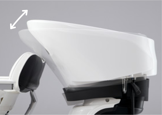 座面と連動してスライドし、腰にぴったりとフィットしながら回転するランバーサポートが、お客様に無理のない自然な快適姿勢を提供します。お客様の個々の身長差を吸収しながら、シャンプーに適したフェイス角(=20°)をキープします。