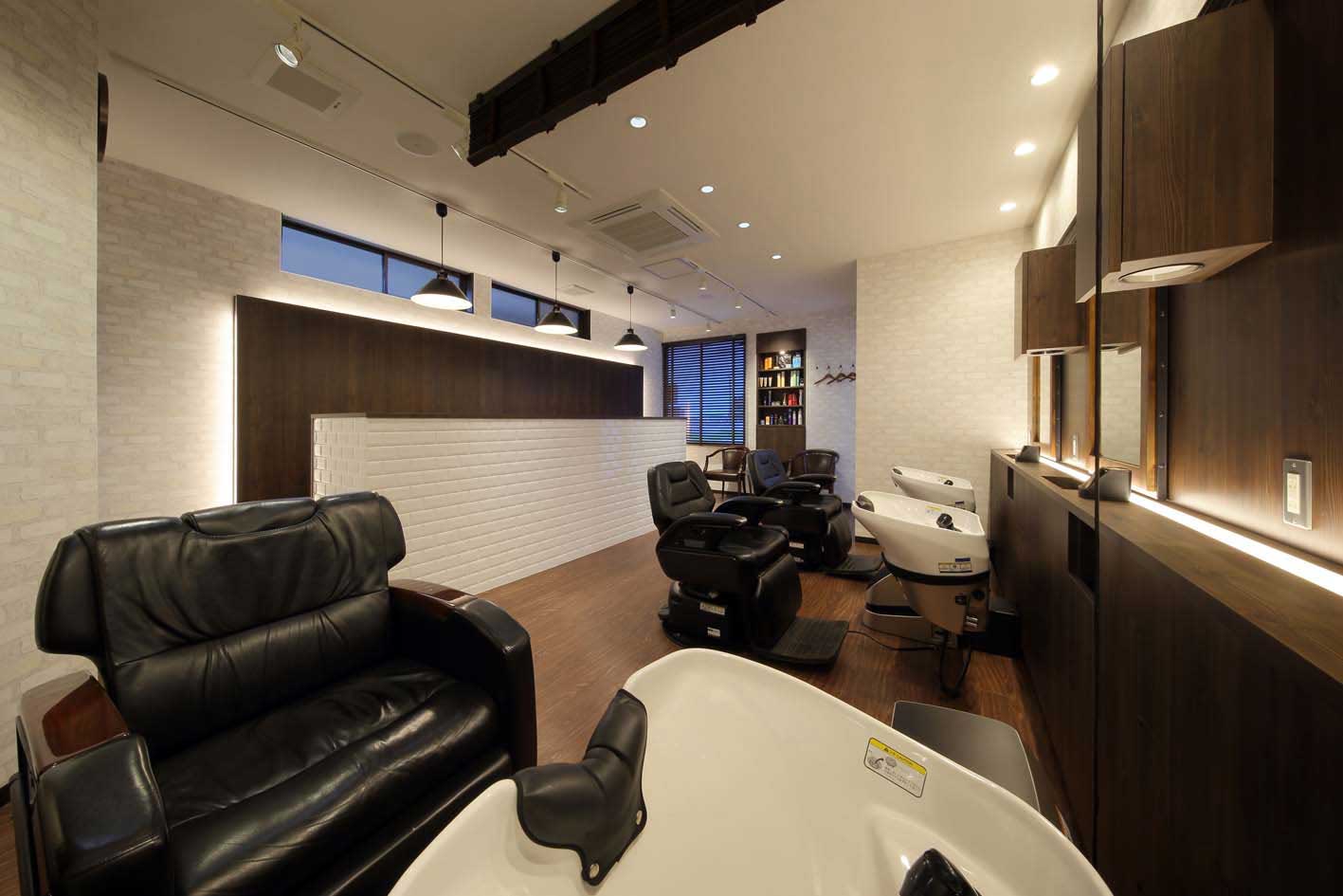 サロンの中心に2.7mのカウンター、パネルを設置した理容室