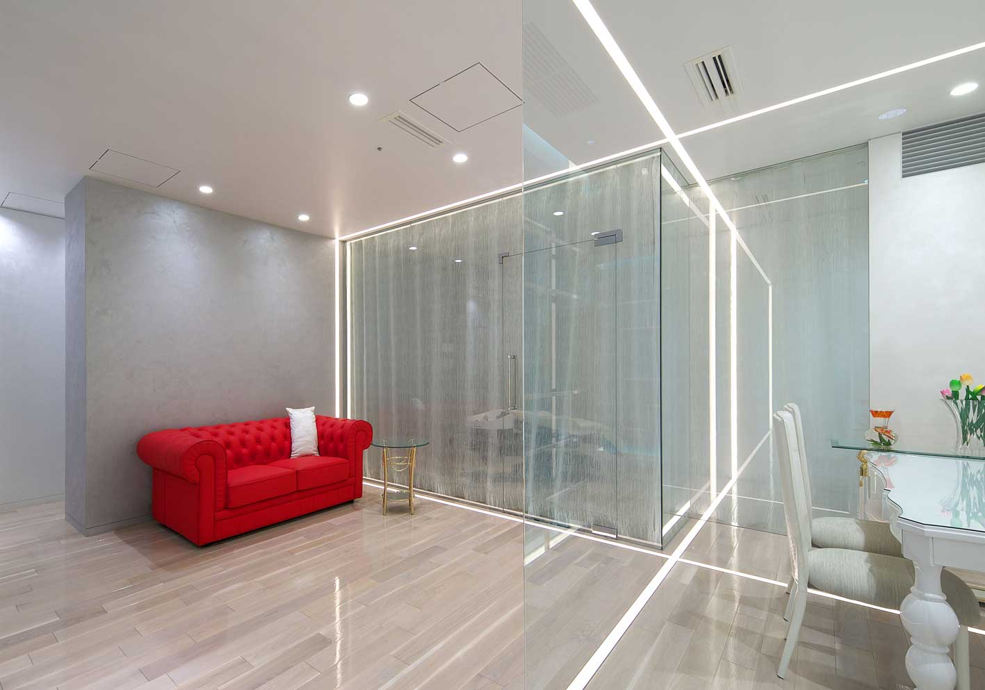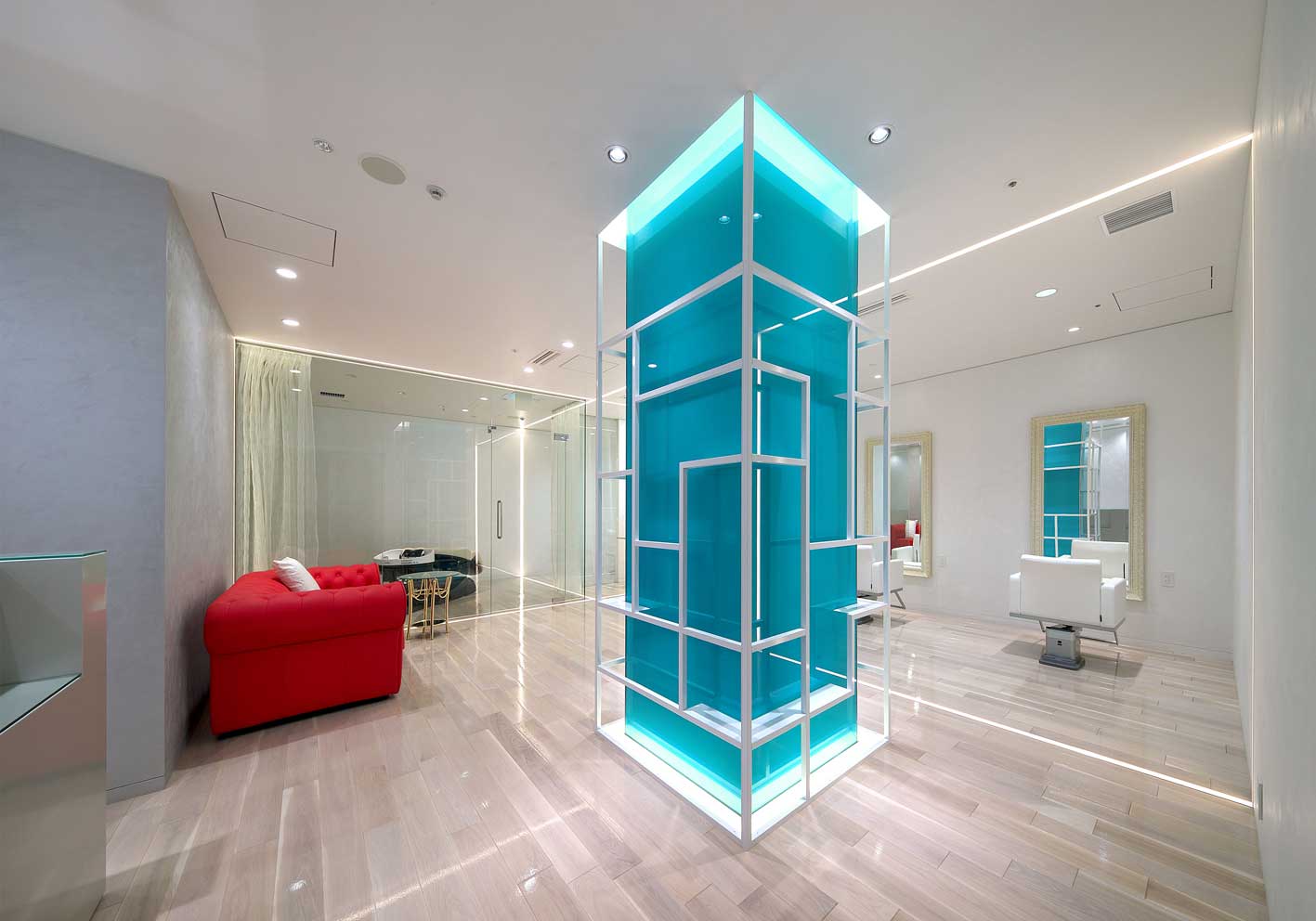 今年6月にオープンしたコンラッドホテル大阪の38階にあるサロン。上下左右へと繋がり交差するラインは、ホテルコンセプト「Your Address in the Sky」にならい浮遊感を表現。サロンを貫く大きな躯体柱をそのまま空に見立て、様々なディスプレイができるような形状とした。