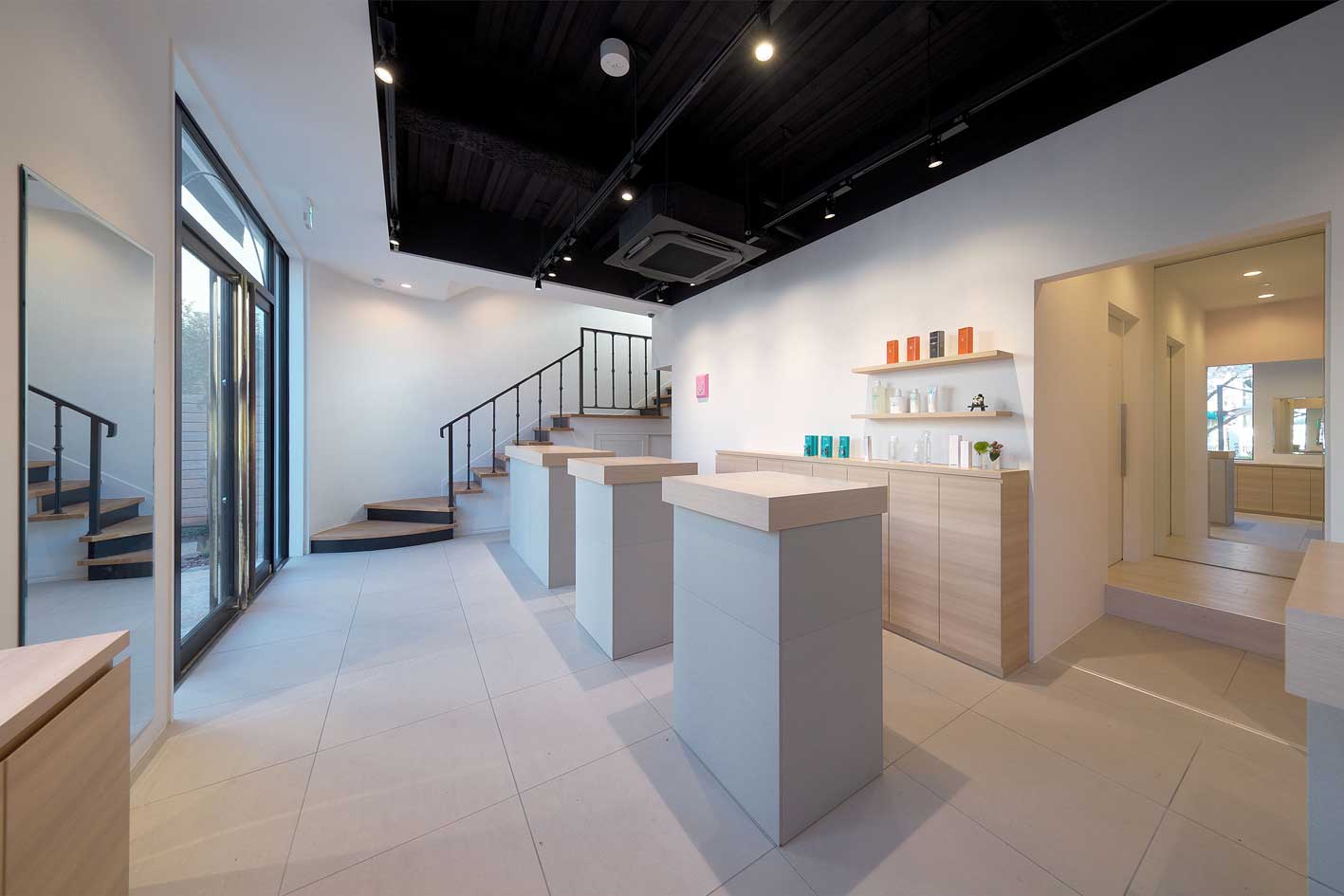 理美容とカフェの併設の為、隔壁を作る必要があるが、繋がりのあるデザインにしたい・・・そのため隔壁をガラスで仕切り、理美容の受付・ディスプレイのカウンターとカフェのカウンターを同じデザインで繋げたように見せる事で一体感を演出。