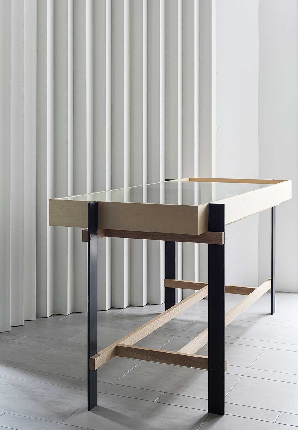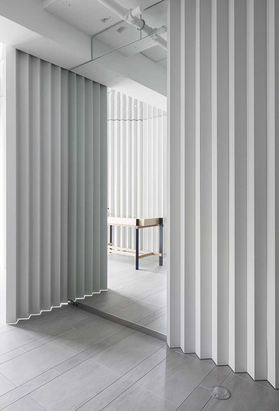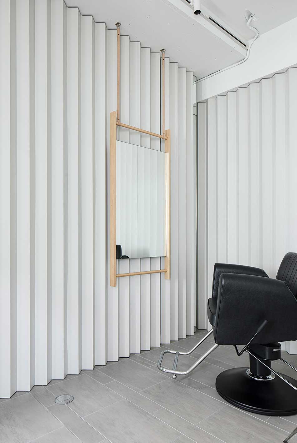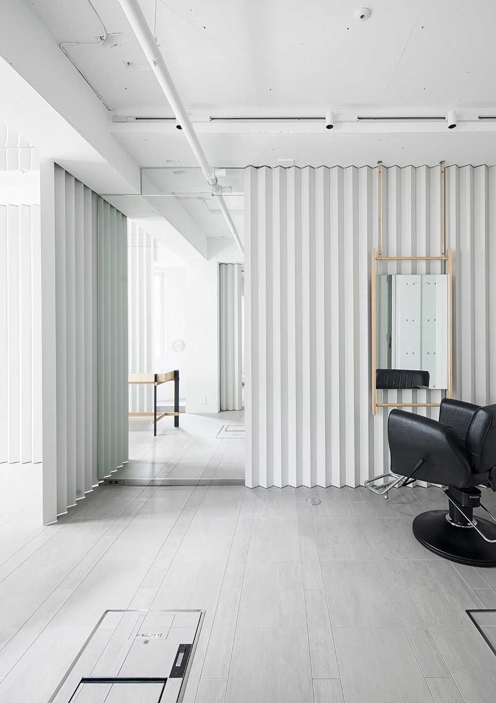 わずか7坪の美容室の計画。「Nine(ナイン)」は有名店でのリーダーを経て、40代となったユニークな技術者が満を持して開業する、上質なサービスを提供する美容室。コンパクトながらも、非日常性を感じられるサービスにふさわしい空間が求められた。また、遊び心を忘れないとのコンセプトからリクエストされたのは「ありそうで、ない空間」。検討を重ねた結果、壁、扉、パーテーションといった要素をプリーツカーテンに模して、空間を囲む提案をした。屋根用の白色ガルバリウム板を折り曲げて製作する硬質なプリーツは、壁、扉、パーテーションなどを一体的に背景化して、襞によって現れる陰影で空間を埋め尽くす。素材特性は壁の表面強度や傷の目立ちにくさ、タイマーやメモといった備品の磁石利用など、コンパクトな作業空間において重要となる機能面をフォローする。小さな空間においてとりわけ存在感を放つ扉、把手に折板のデイテールで対応するなどの工夫によりプリーツに溶け込ませた。レセプションカウンターでは、空間におけるヴォリュームの印象を抑えるため、またお客が足を引っ掛けにくい工夫として、脚の形状に卍型を採用してコーナーから脚をずらしている。