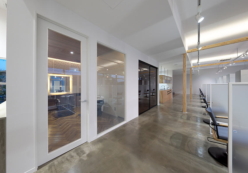 木造平家ワンフロアの平面に待合の吹き抜け部分を塔屋にしてボリュームを構成し外観上のポイントにした。メニュー構成は基本的なヘアメニューに加えてスパ、ネイル、エステと総合的なトータルビューティーを施術するためのそれぞれの空間をデザイン面、機能面においてトータルにまとめ構成した。