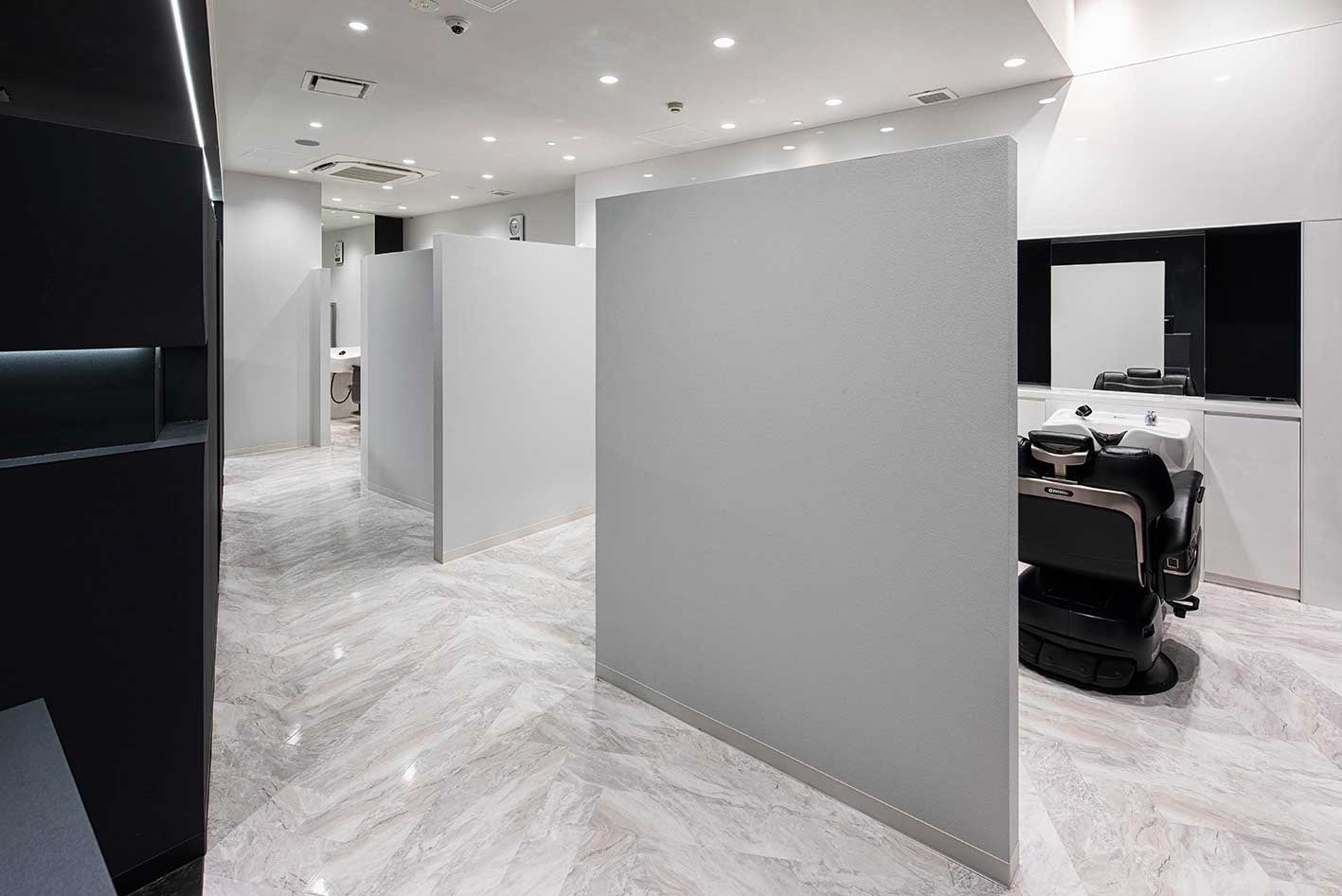 平面構成には、鋭利な剃刀を彷彿とさせる斜線を意図的に多く取り入れた。アイキャッチになるライン照明は黒い空間を強調させ、サロンのアイコンになっている。