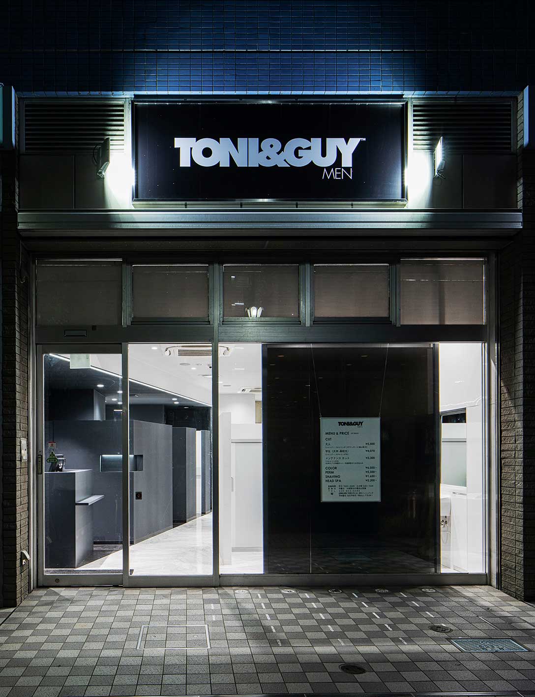 TONI&GUYのMENS店として、白い光沢のベースをマットな黒で切り込んだ、統一されたモノトーンが醸し出す重厚感ある空間を提案。