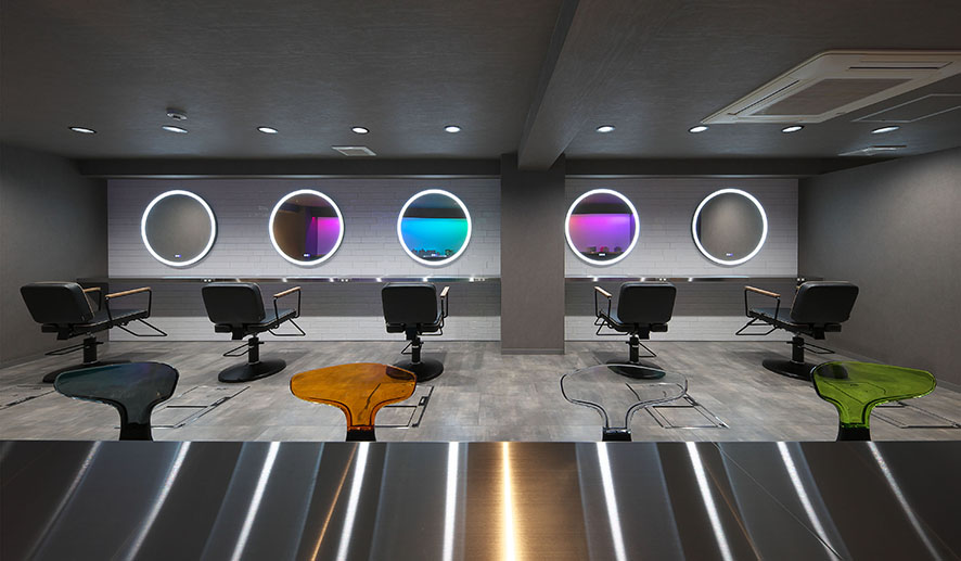 昨今、多種多様のカラーを楽しむ人が増えている中、本当に色々なカラーを提供できる店はそんなに多くない。mellではそんなカラーのニーズに応えられる数多くのカラー剤を完備しており、それに対応すべくカラーにこだわりのある人がバーに来た感覚でカラーを楽しめる空間づくりをした。