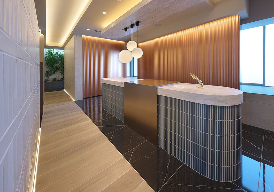 リブや格子、タイル、金属、左官、マット・反射など様々な質感と色彩を、南北から差し込む採光と照明を利用して空間に落とし込み、光によって目地や凹凸の模様を浮かび上がらせた。
