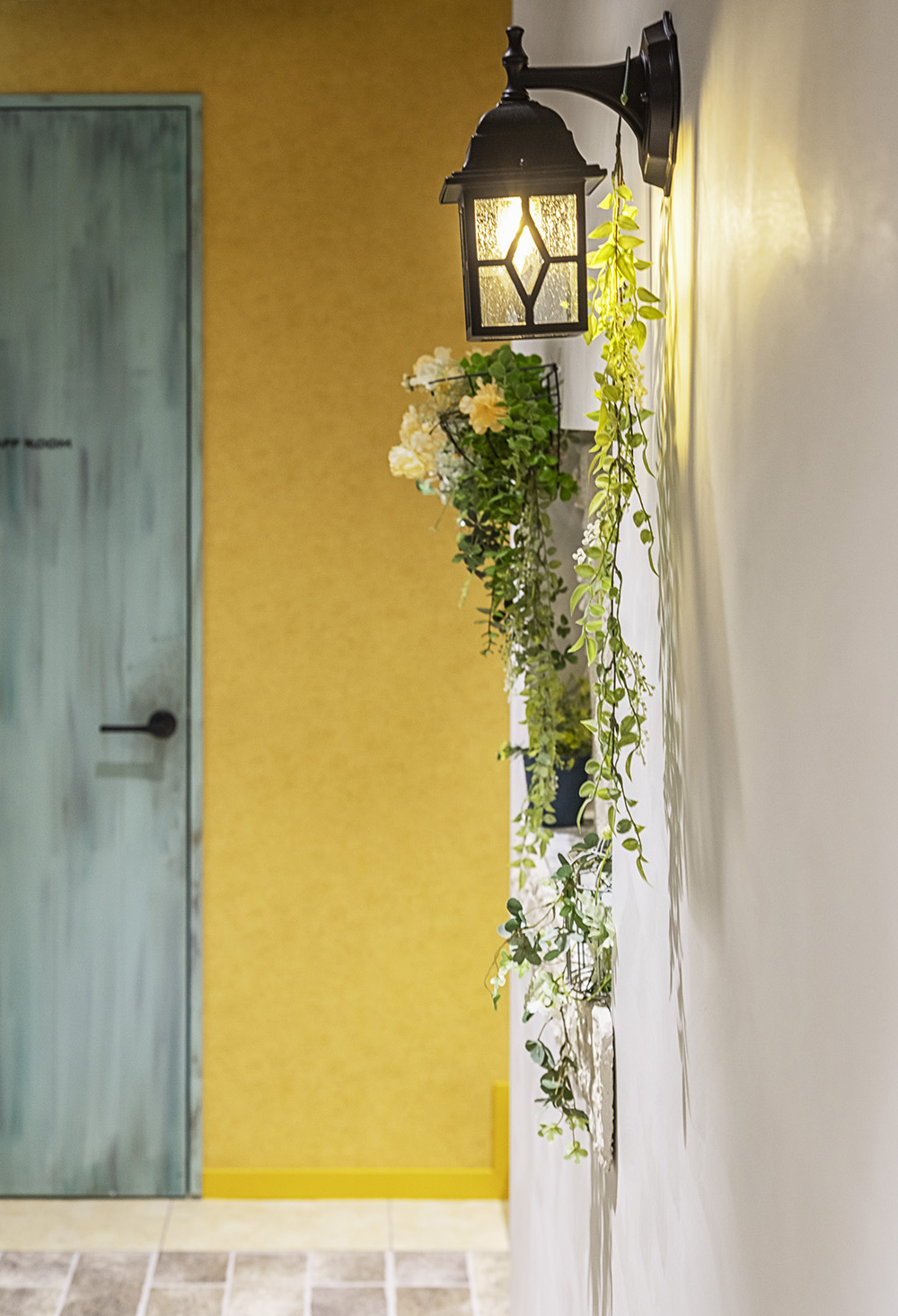「ヨーロッパにあるような、カラフルな街並みのようにしたい」とお客様からの要望があった案件。入り口を入って広がる空間はそれぞれの壁を外壁に見立て、通路部分の塩ビタイルをレンガ調にすることで、ヨーロッパの街の小道を演出した。
