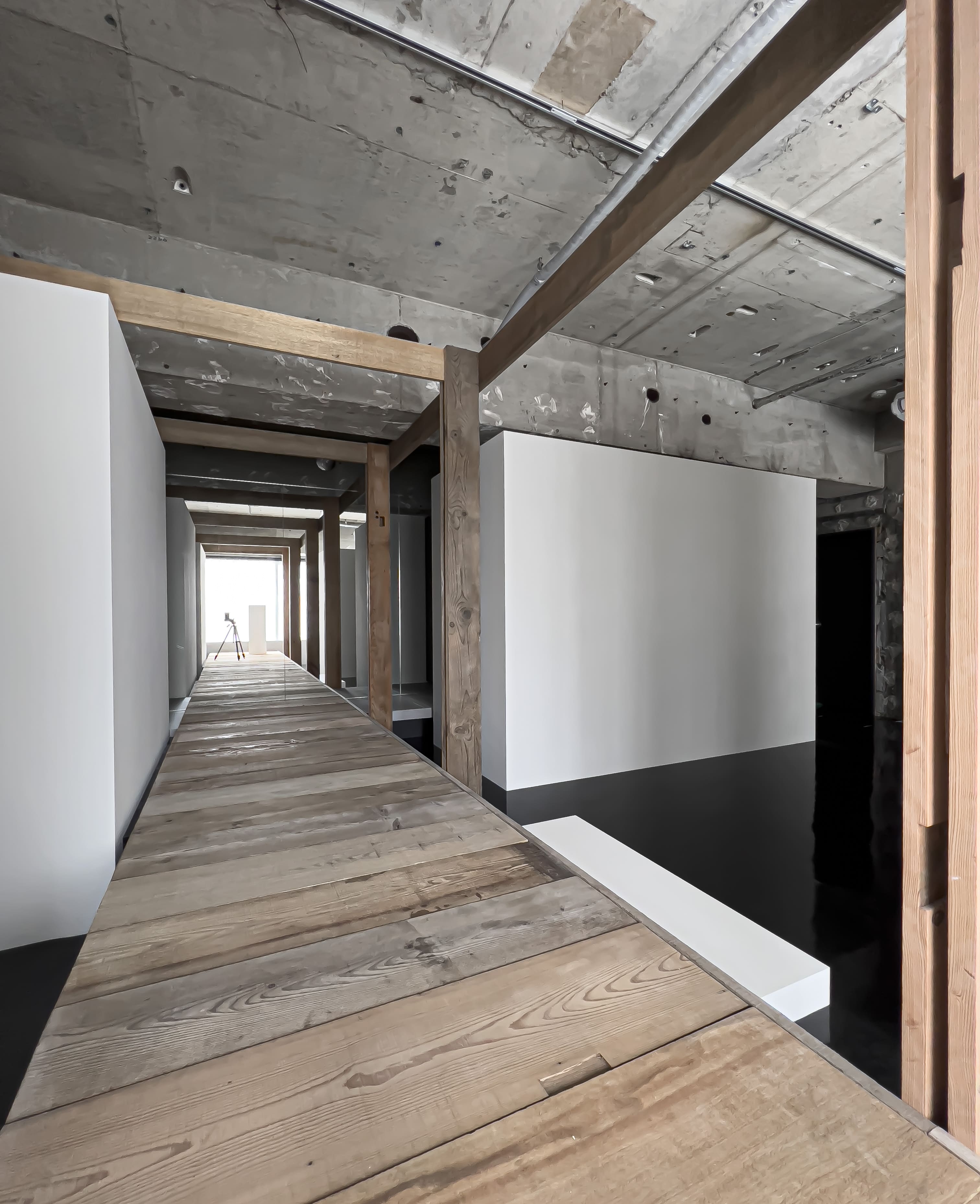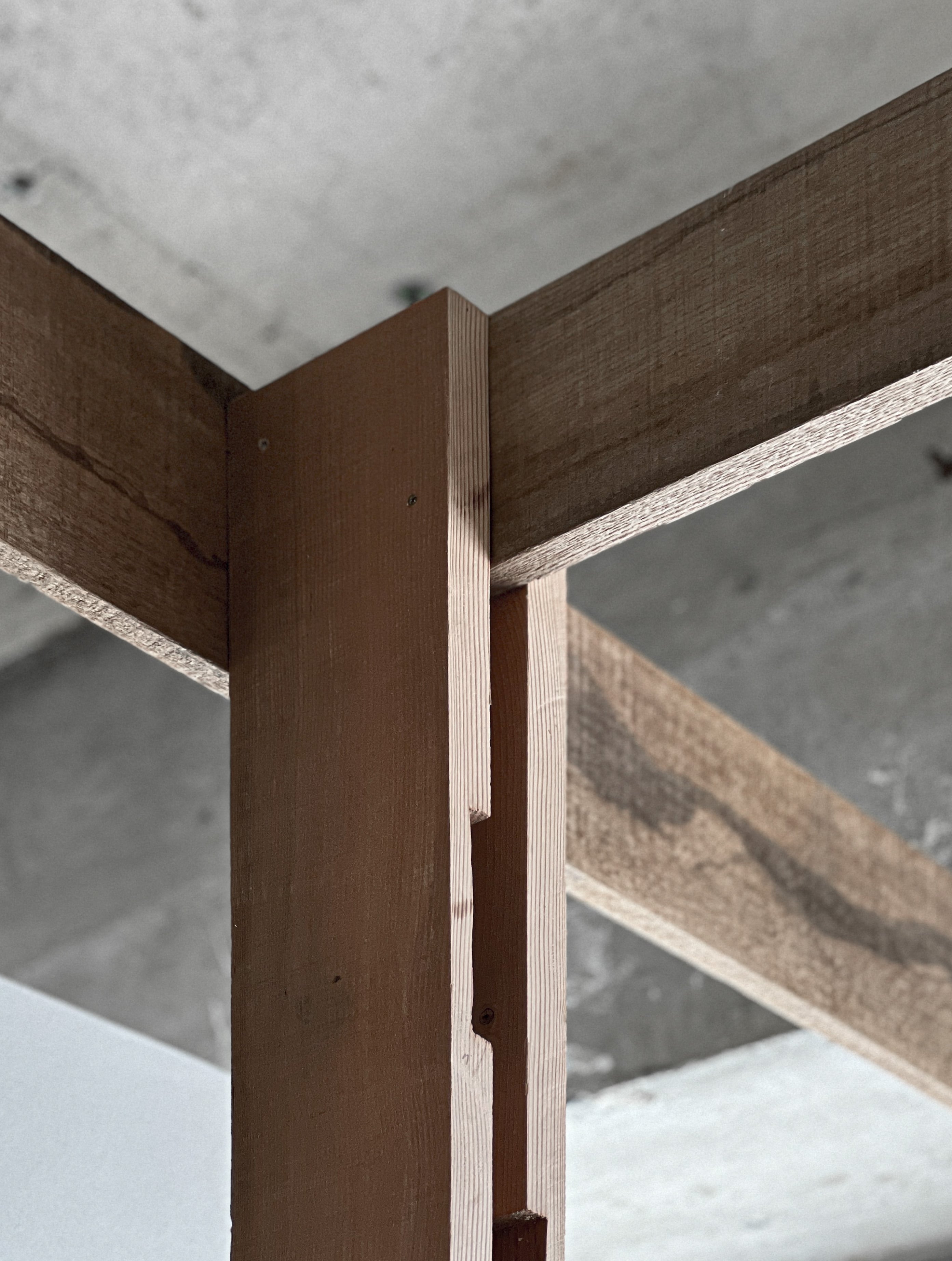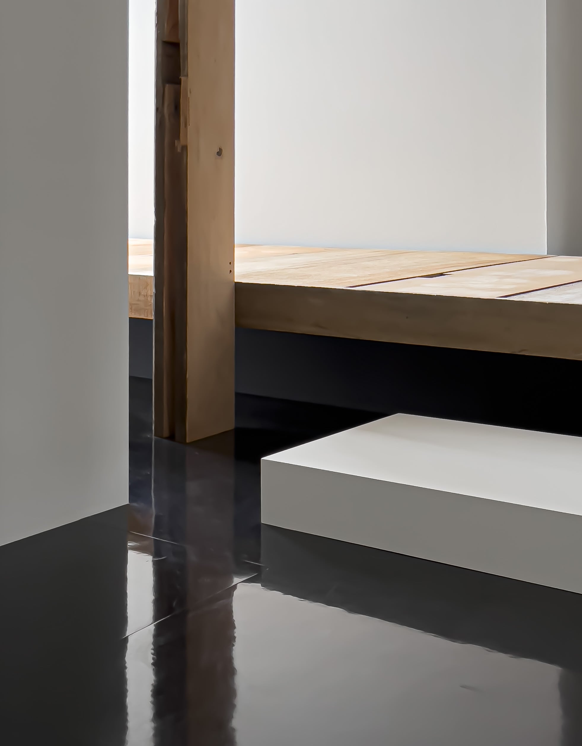それらの要望をまとめ、4つの部屋を十字型の通路空間でつなぎ合わせる「田の字」レイアウトを採用。個室のプライバシーを高めることはもちろん、移動する際の期待感やリセットする時間など通路空間での体験に着目して空間を構成した。黒い水盤を思わせる空間から、桟橋を思わせるウッドデッキの空間に進むと、先にはルーフバルコニーからのふんだんな自然光が待ち受け、そこから脇に降り個室へと進む導線をデザインした。進むに連れてシーンの変化が現れ、記憶に残る空間となっている。また、デッキや柱には木造住宅の解体時に取り外した古材を使用。加工や経年変化の跡、色ムラ等はそのまま使用し、外にいるような印象を空間に添えている。