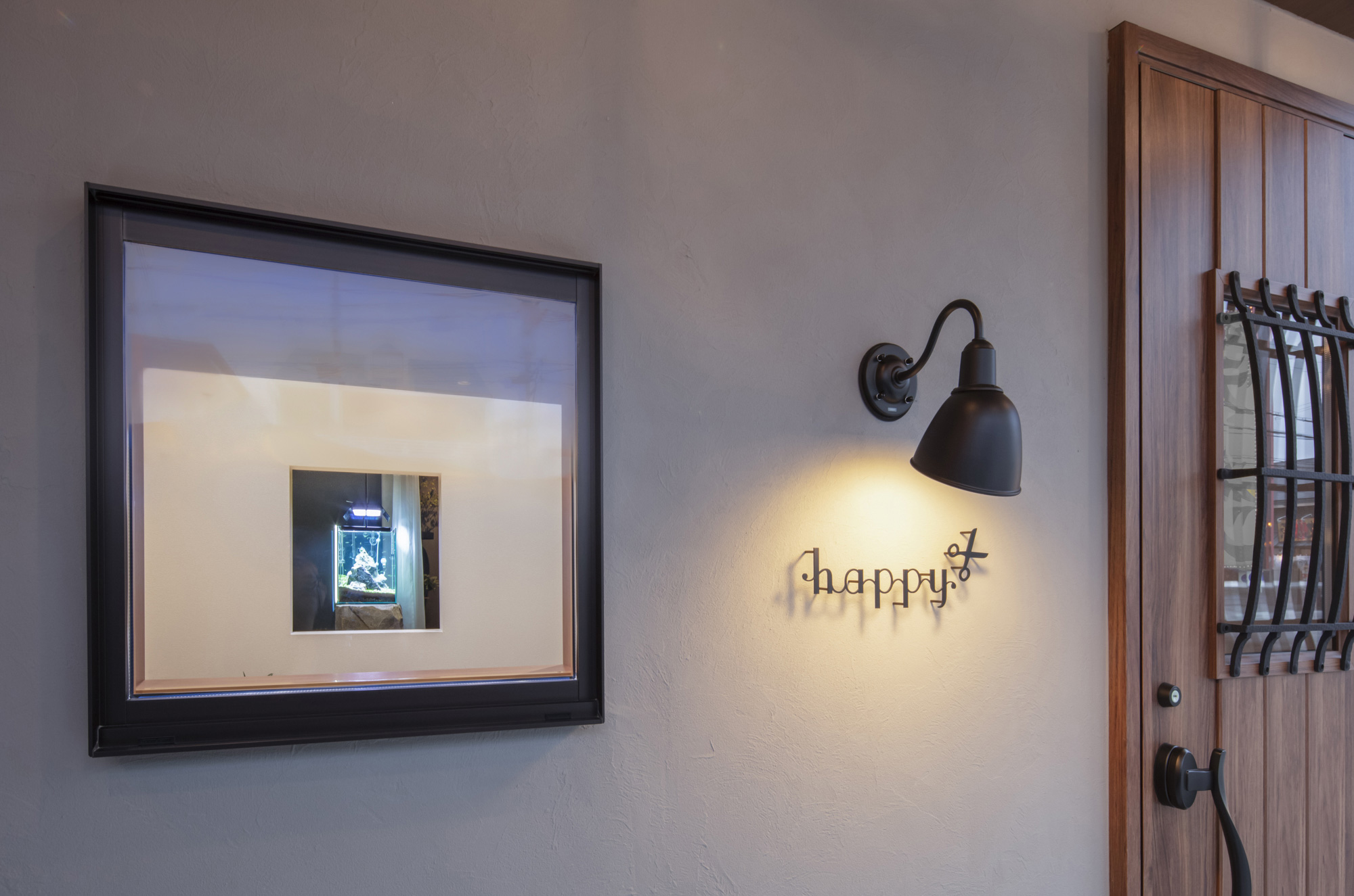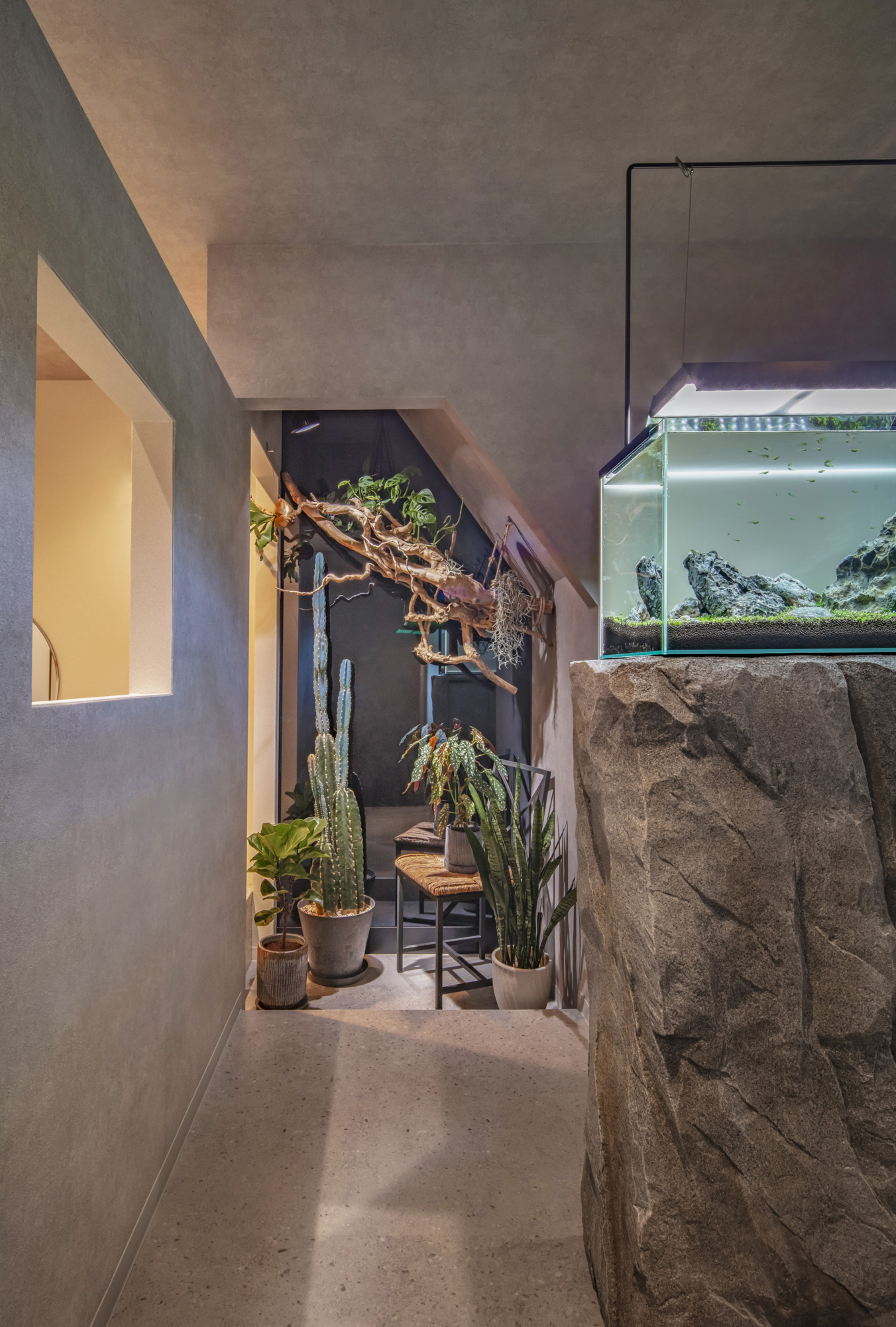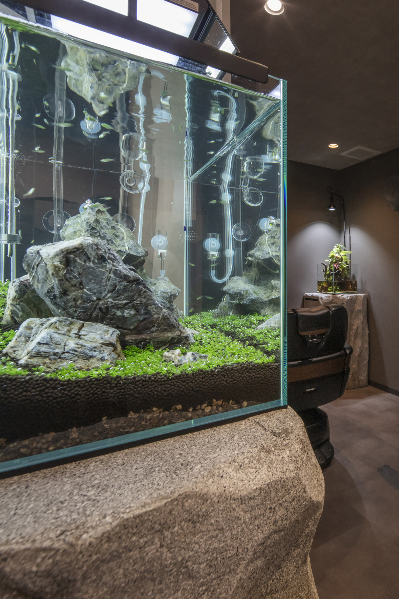 夫婦で営む理容室の改装案件。「オーナーの趣味であるアクアリウム水槽を置きたい」「2つの半個室は違う雰囲気にしたい」といった大きく2つのご要望があり、これらを軸にプラン作成が始まった。メインとなる水槽を中央に配置し、且つ2つの半個室を両端に置くレイアウトを計画。手前の個室は明るい外をイメージした空間、その2つを繋げる細い通路は奥に行くほど暗くなっていき、その先にある奥の個室は薄暗く、洞穴に入ったような空間をイメージした。