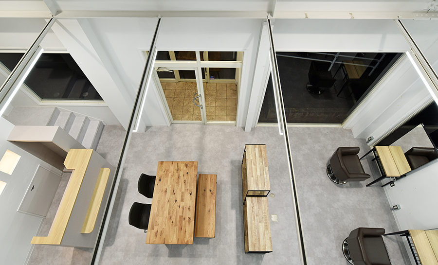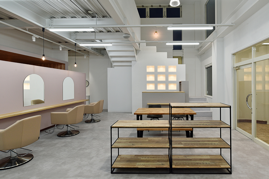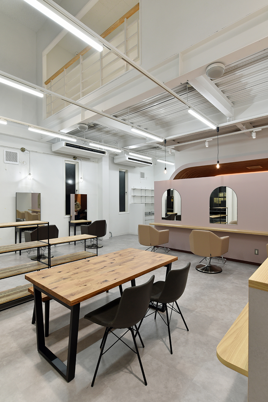 吹き抜けのある空間の中に、天井の高低差があるブースを外周側に配置。その中央を広場のようにセット面と待合、受付とした。全体が一つの空間として”集まる”パティオの様な美容室を構成した。シャンプーブースは広場の壁裏になる場所となり、天井を低く取る事でヘッドスパの施術に集中できる空間をつくった。