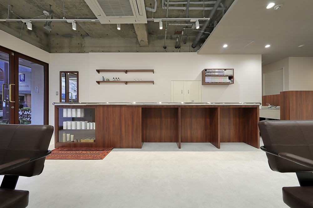 オーソドックスな美容室のレイアウトながら、大きなカウンターを背面に設置し、一見ショップやバーカウンターを思わせるデザインとした。カウンターに鏡面のSUSパイプと白いタイルを採用し、重厚感とクラシックな雰囲気を感じられるようにした。