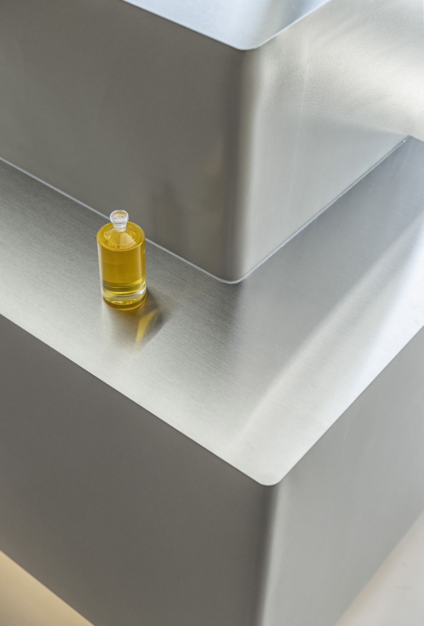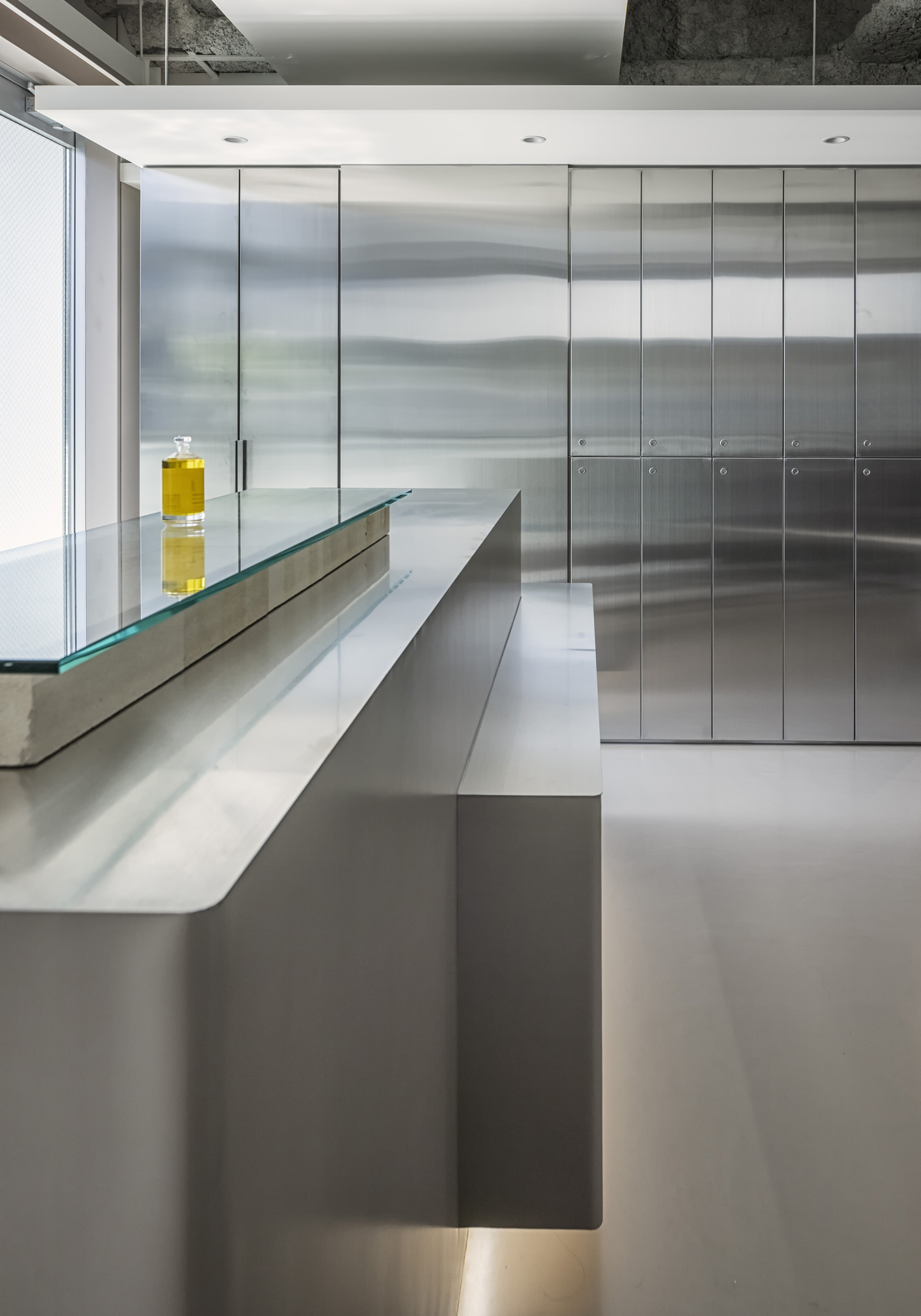 見晴らしの良い開口部を背に、受付を配置。空間の広がりを担保するため、スタインリングブースとシャンプーブースはオープンとしているが、最低限の視線制御を施している。軒形状や色彩計画で視覚情報を整理しつつ、一部耐火レンガの質感や長尺シートを用いた丸く処理したディティールなどを配置。