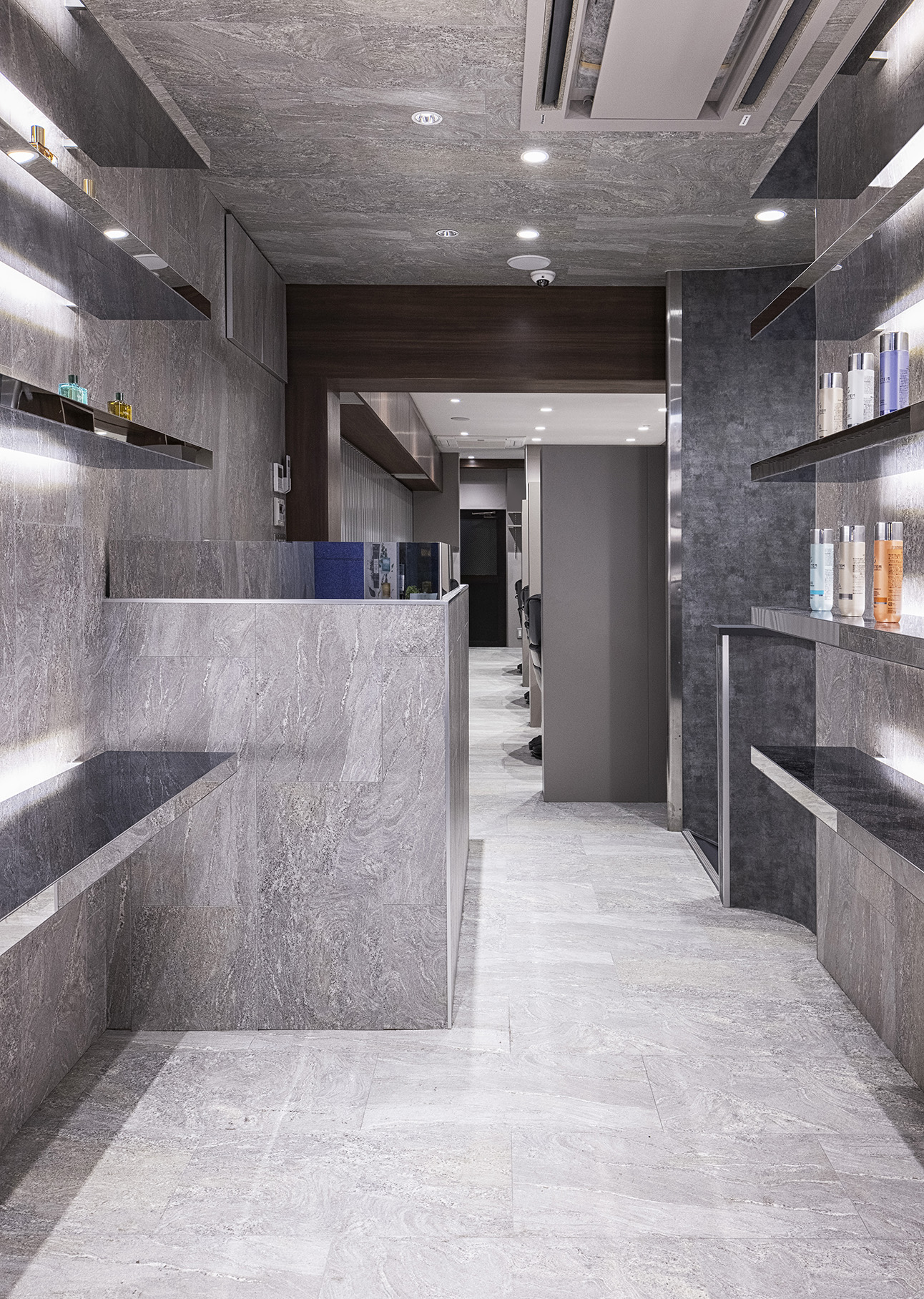 1Fは柱・梁によるメリハリを作り,ミラーによる空間の広がりを作った。B1Fはさらに上質な空間となるよう、反射率を持つ素材を使い、思わず背筋を伸ばしたくなるような緊張感も内包させている。