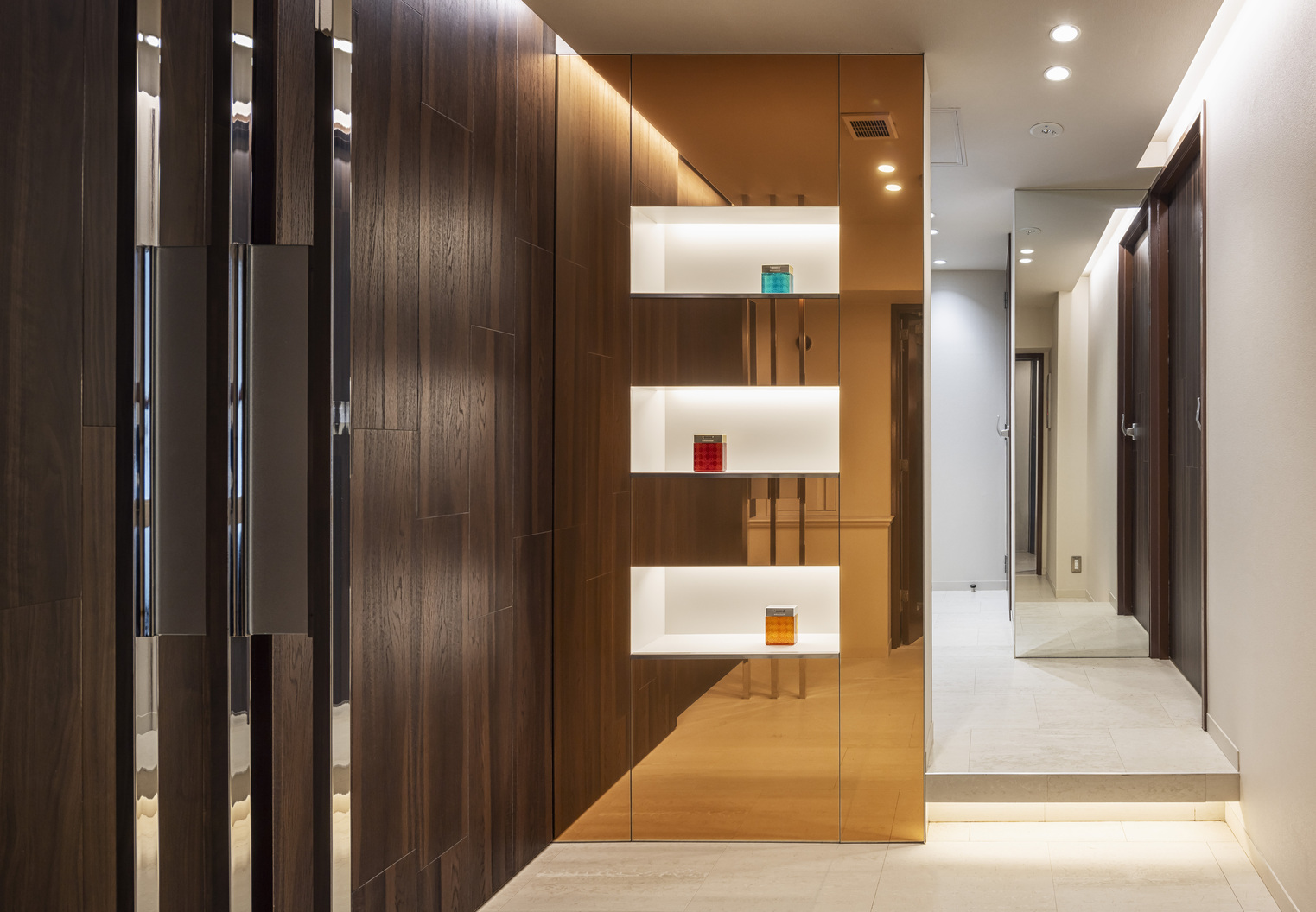 ミラーの反射を活かし、決して広くない店内に視覚的な広がりを演出。イメージカラーのオレンジにカラーリングされたミラーをエントランスに配置し、シンボル的な存在とした。施術空間にはコート掛けを壁に埋め込む等、余計な家具が見えないように工夫した。