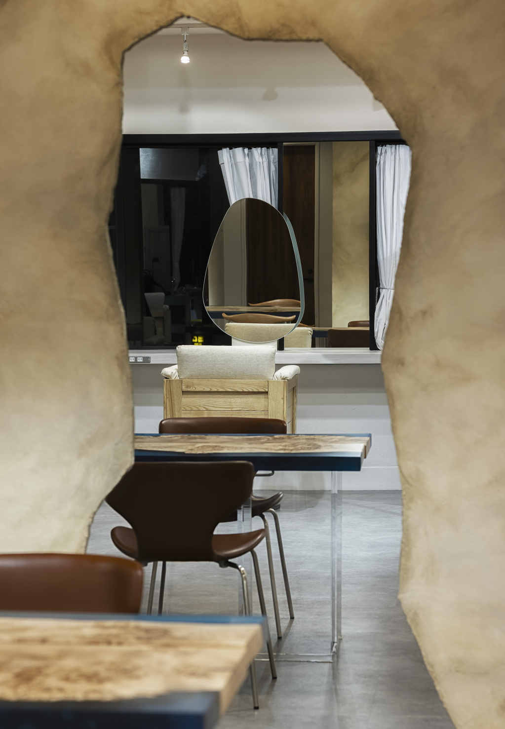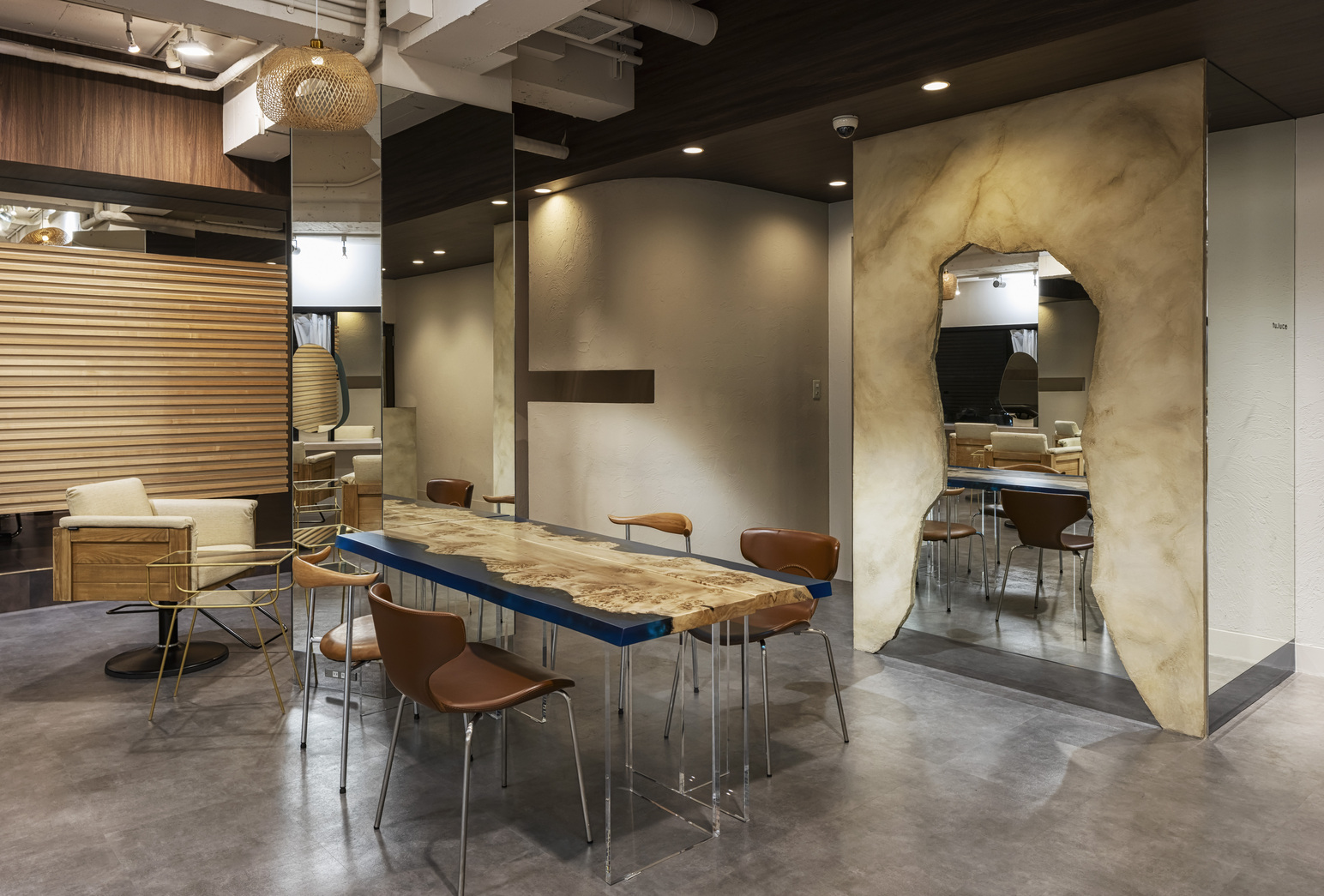 柱型の細長いミラー、店内中央の柱を生かした五角形のミラー、横に長いミラー、丸みのある動かせるミラー、洞窟の入口のようなミラーなど、それぞれ個性のあるミラースペースを随所に配置した。素材感としては、既存のものを残しながらイメージを変えていく必要があったため、エイジングやルーバーなど形状に個性を持たせることで、内装のイメージを変えていった。個性の強いものの集合体になるため、それらをまとめる役割として、コンクリート調の床材を採用した。