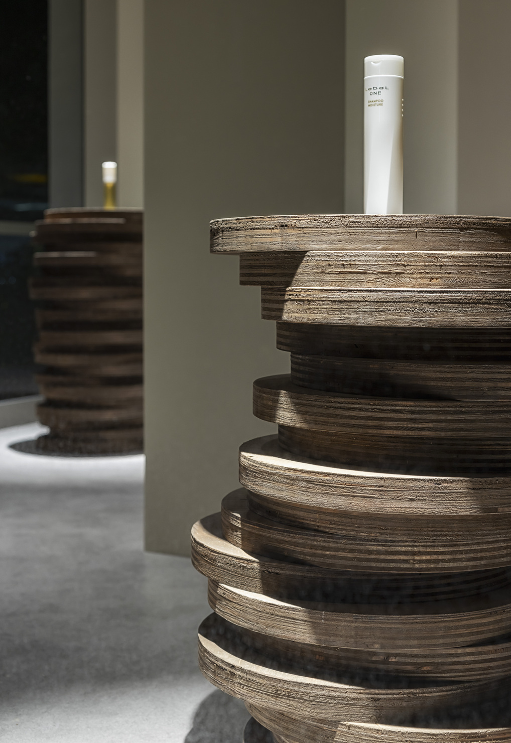 積層された什器はサロンで使用するこだわりの粧剤をディスプレイする什器でもある。